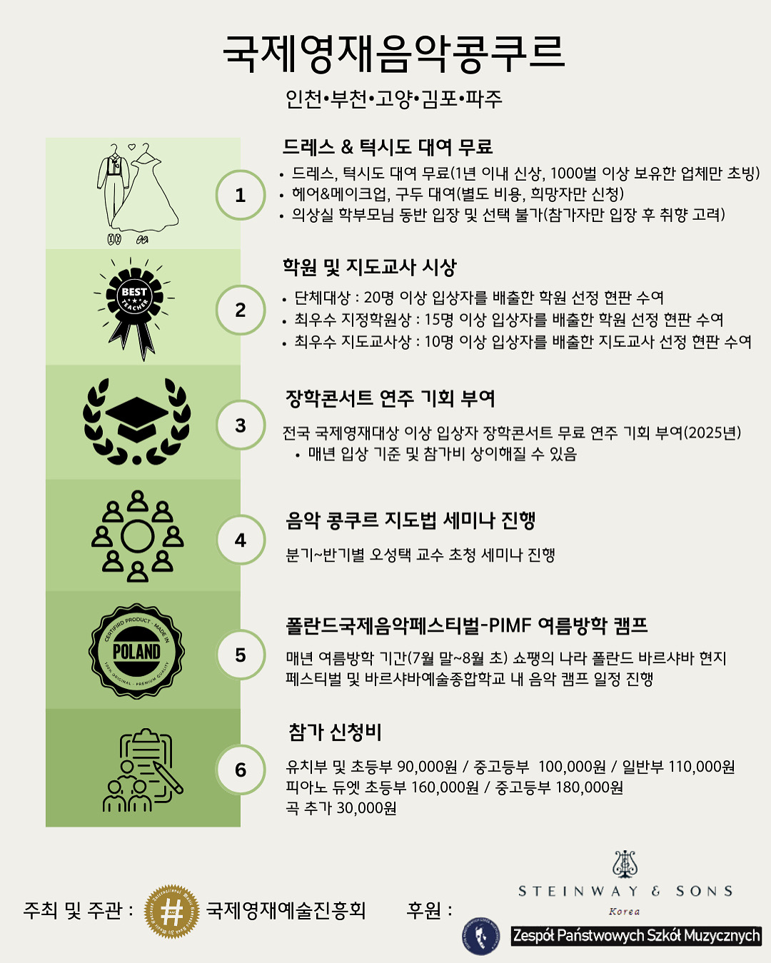 - 전국 국제영재대상 이상 입상자 장학콘서트 무료 연주 기회 부여(2025년)